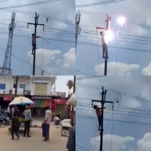 A video showing a man being electrocuted while trying to save a bird trapped on a high tension wire has been shared online.
