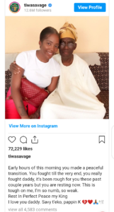 Society gazette reports that female musician, Tiwa Savage has lost her dad in the early hours of today.