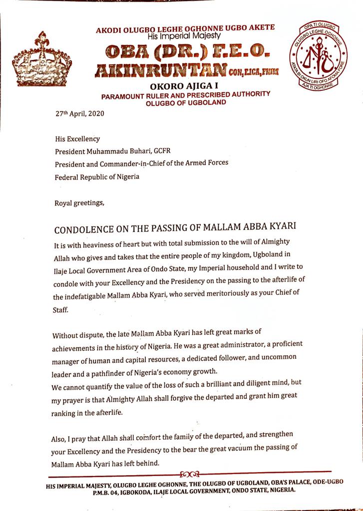 Oba Dr. Frederick Obateru Akinrutan, (Okoro Ajiga 1), the paramount ruler and prescribed authority, the Olugbo of Ugbo Land has sent his condolence message to President Buhari, over the death of his Chief of Staff; Mallam Abba Kyari who was buried last week.
