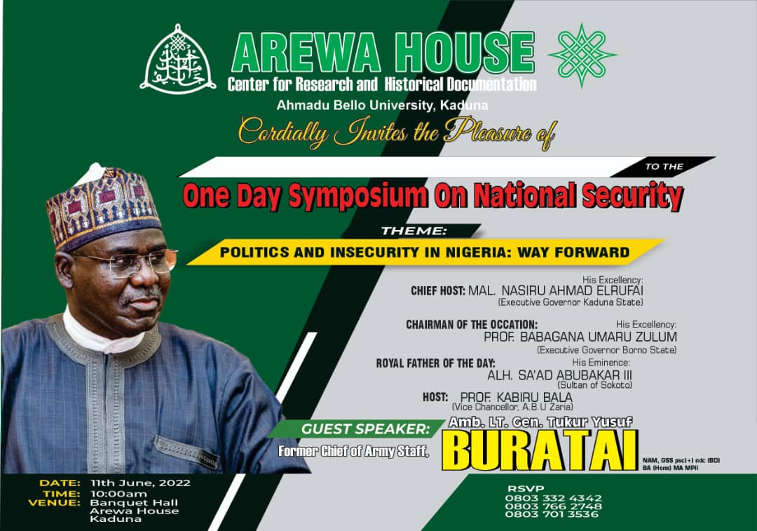 National Association of Online Security Reporters, NAOSRE reports that the lecture would take place at a day symposium on national security organised by the centre for research and historical documentation, Ahmadu Bello University with the theme: “Politics And Insecurity In Nigeria: Way Forward”.