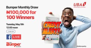 Pan African Financial institution, United Bank for Africa (UBA) Plc has again given its loyal customers reason to cheer as it rewarded 100 loyal customers with N100,000 each in the UBA Bumper account draw. The draw, which took place at the UBA Head office on Tuesday, was held via the Facebook ...