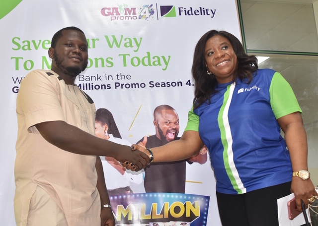 Regional Bank Head for Abuja Bank 1, Fidelity Bank PLC, Vanessa Mordi (R) congratulates One Million Naira winner from Maiduguri, Gyari Daniel, at the 2nd Monthly/ 1st Bi-Monthly Draw of Get Alert In Millions (GAIM 4) Savings Promo Season 4, in Abuja on Thursday