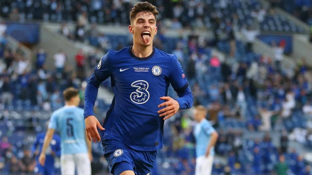 Kai Havertz celebrates his first-half goal to give Chelsea the lead against Man City in the Champions League final