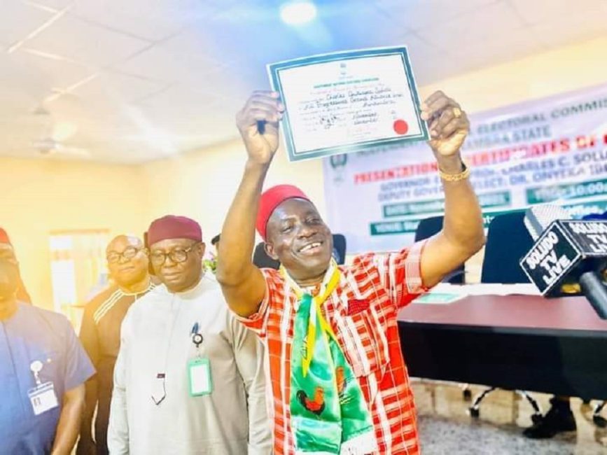 The Independent National Electoral Commission, INEC, has presented a Certificate of Return to Mr Charles Soludo, the winner of Anambra State governorship election.