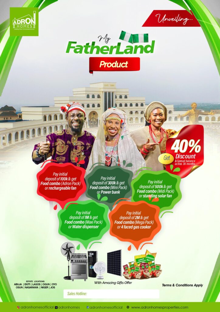 The “My Fatherland” product is now officially launched, offering you the chance to secure your dream land and enjoy unmatched benefits. Visit www.adronhomesproperties.com or call 08138432335 and you can also connect with us on social media for more details.