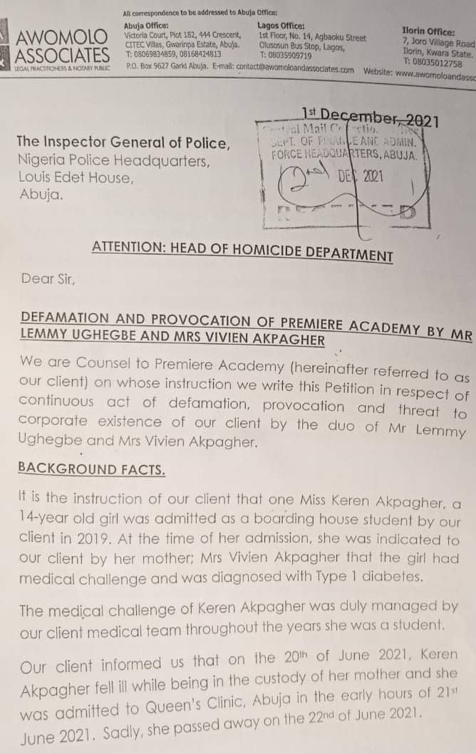 Nearly six months ago, Premiere Academy entered media spotlight when news broke that one of its students, Karen Happuch Akpagher, had died in a hospital in Abuja. The news of the death of the 14-year old diabetics’ patient which occurred on 22nd June, 2021 soon became a hot issue as several media stories authoritatively claimed she was raped to death, sodomized and forced into an oath of secrecy to booth.