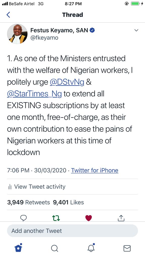 The clarion call by the Minister of State, Labour, Mr. Festus Keyamo SAN FCIArb (UK) to telecommunication companies and Pay-TVs in Nigeria to come up with a social safety net programme for the masses to ease the Covid-19 pains has began to yield results with a swift response from one of the telecommunication giants.