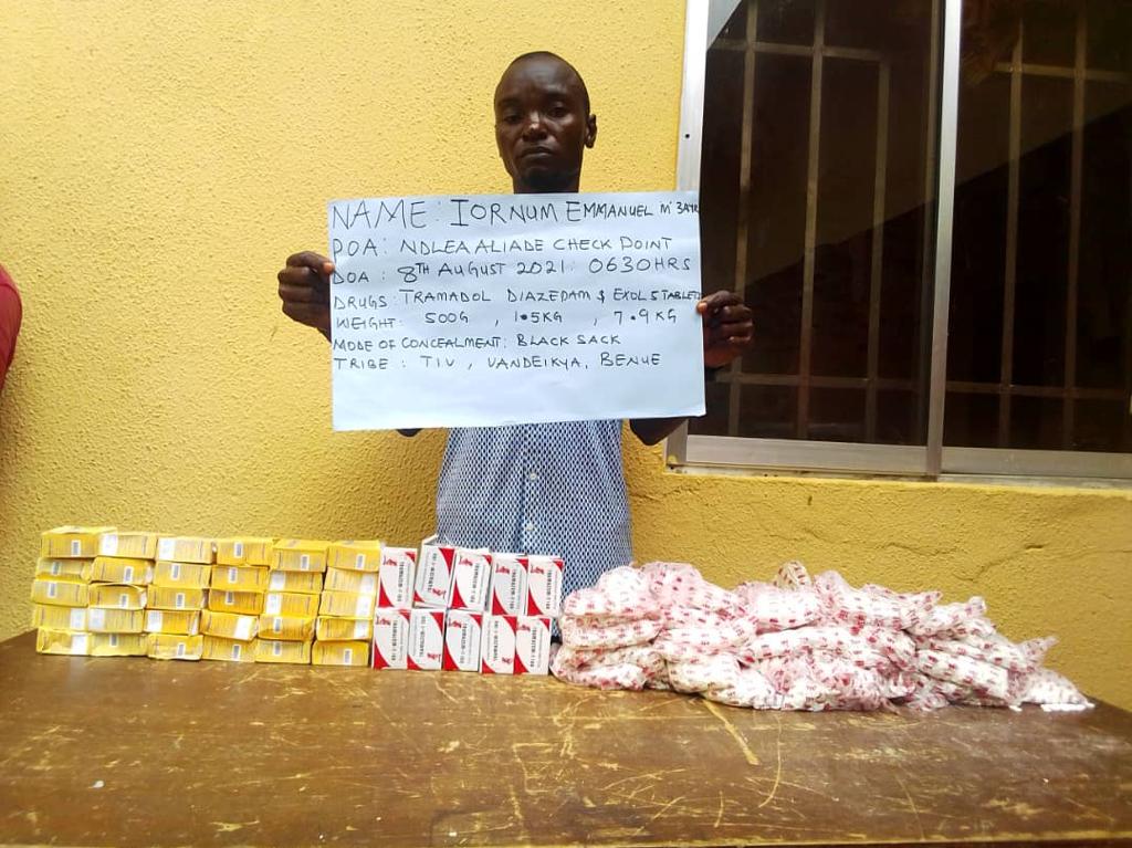 In Benue state, a 34-year-old Iornum Emmanuel was arrested at the NDLEA Aliade checkpoint on Sunday 8th August, 2021 with different quantities of assorted illicit drugs, which include; tramadol -500grams; diazepam- 1.5kg and exol 5- 7.9kg.