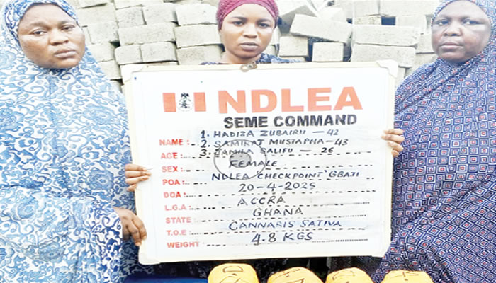 He said, “At the Seme border area of Badagry, Lagos, three Ghanaian ladies were on Sunday 20th April arrested at the Gbaji checkpoint by NDLEA operatives while attempting to smuggle a combined 4.8 kilograms of Ghana Loud, a strong strain of cannabis into Nigeria. The suspects arrested include: Haziza Zubairu, 42; Samirat Mustapha, 43; and Jamila Salifu, 26.”