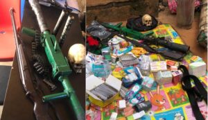 The Anambra Police Command, Friday, recovered a human skull, one locally-made rocket propelled granade RPG launcher, two (RPG) bombs, one single- barrel gun, empty chain of bullet, one Toyota Sienna and one Mercedes Benz jeep from criminals at Amukabia, Achalla, Awka South LGA.