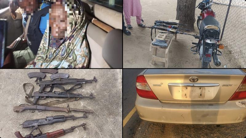 “Exhibits recovered from the scene include Four AK-47 rifles, two locally made pistols with ten rounds of live 9mm ammunition, eleven rounds of live 7.62mm ammunition, one locally made shotgun, a 2004 Toyota Camry LE, and a red boxer motorcycle,” the statement added.