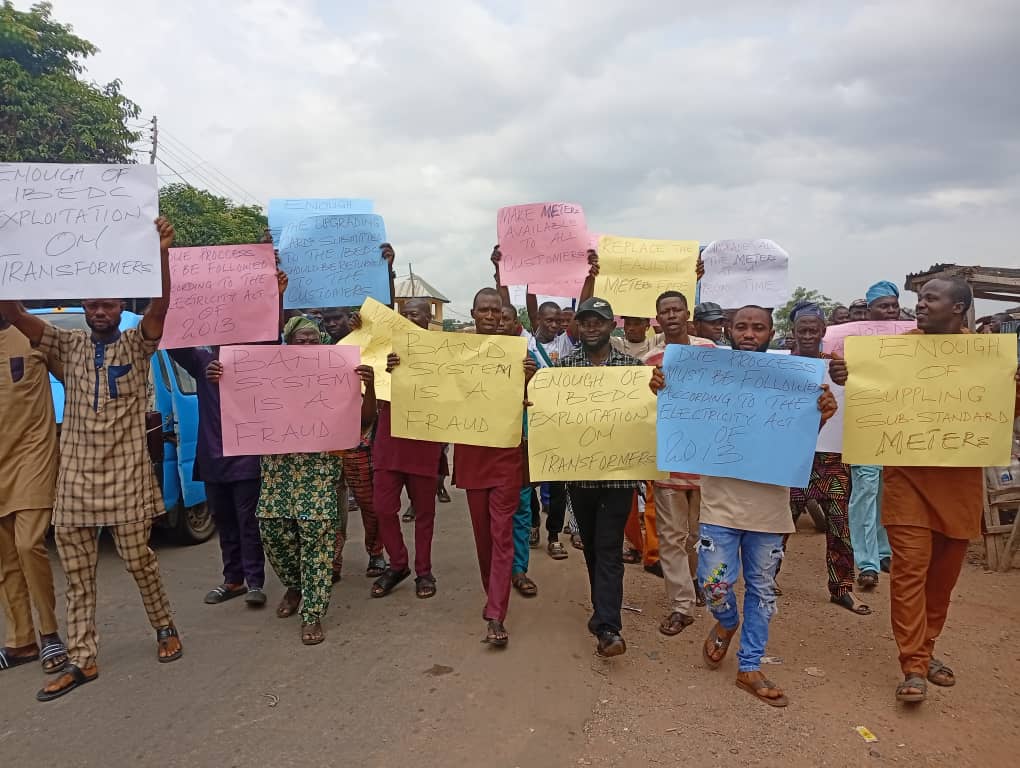 Chanting protest songs and carrying placards with inscriptions such as ‘Band is a fraud’, ‘Enough of IBEDC Exploitation on Transformers’, and ‘Make meters available to all customers’, the protesters marched through Osogbo/Ibokun road to press their demands.