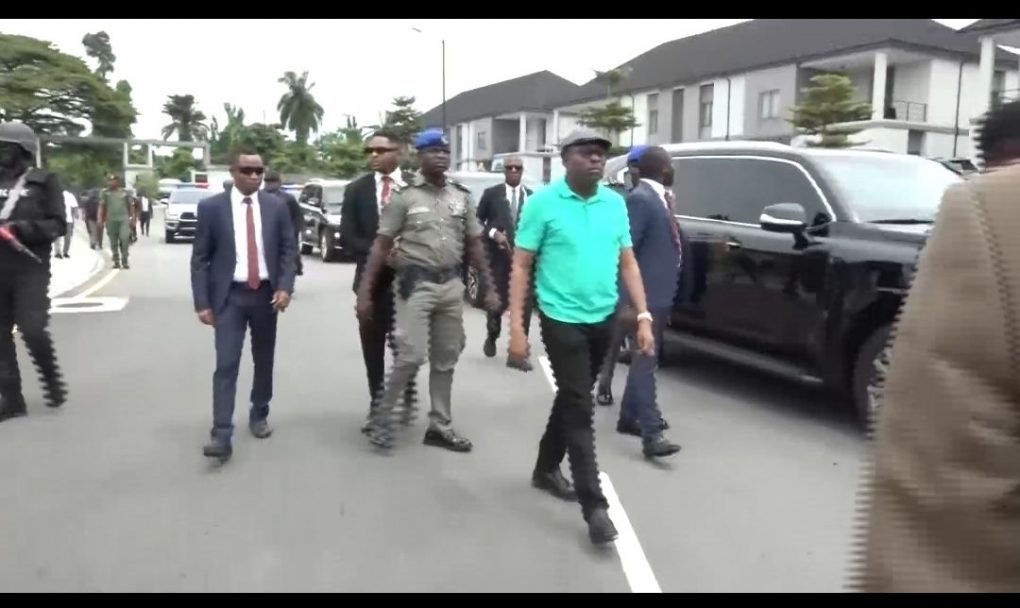 Governor Fubara in light green T-Shirt and cap at the Rivers State House of Assembly quarters in Port Harcourt on Thursday
