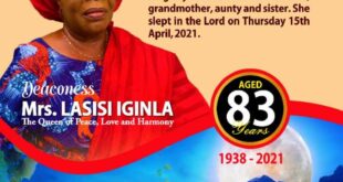 The General Overseer of Champions Royal Assembly, Prophet Joshua Iginla is set to bury his beloved mother, Dcns. Mrs Lasisi Iginla in grandstyle. She slept in the Lord on Thursday, 15th of April, 2021. The funeral arrangements for mother of the internationally acclaimed prophet Iginla have been pegged to ...