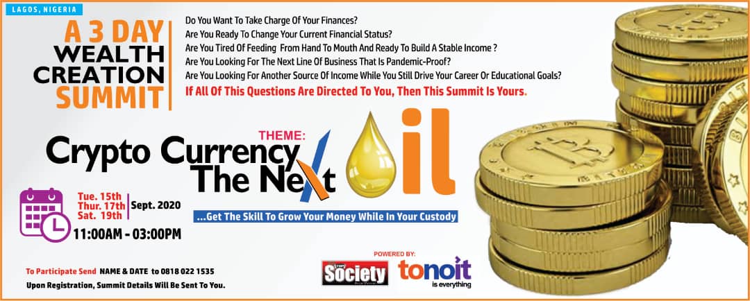 To avoid these aggravating pains and exasperating experience, the Publisher of one of Nigeria’s most widely read softsell TOP SOCIETY MAGAZINE’S, Isaac Ifeanyi Agwazim has decided to organize a 3-Day Wealth Creation Summit in partnership with Satoshi Africa. The theme of the summit is “CRYPTO-CURRENCY, THE NEXT OIL”. The summit will hold on Tuesday 15th, Thursday 17th and Saturday 19th September, 2020. The Three-days summit is scheduled to hold by 11:00AM daily.