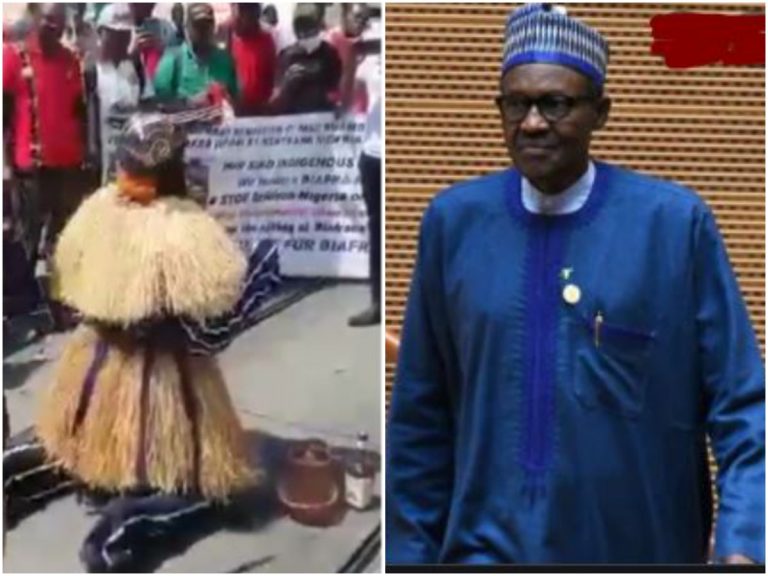 A video of an Igbo masquerade kneeling to beg president, Muhammad Buhari to release the leader of the proscribed Indigenous People of Biafra, IPOB, Nnamdi Kanu during #FreeNnamdiKanu protest in London has surfaced on social media.