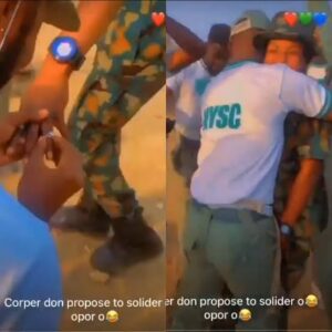 The corps member in a viral video could be seen on his knees as he inserts the ring into the finger of the female soldier amid cheers of fellow corps members.
